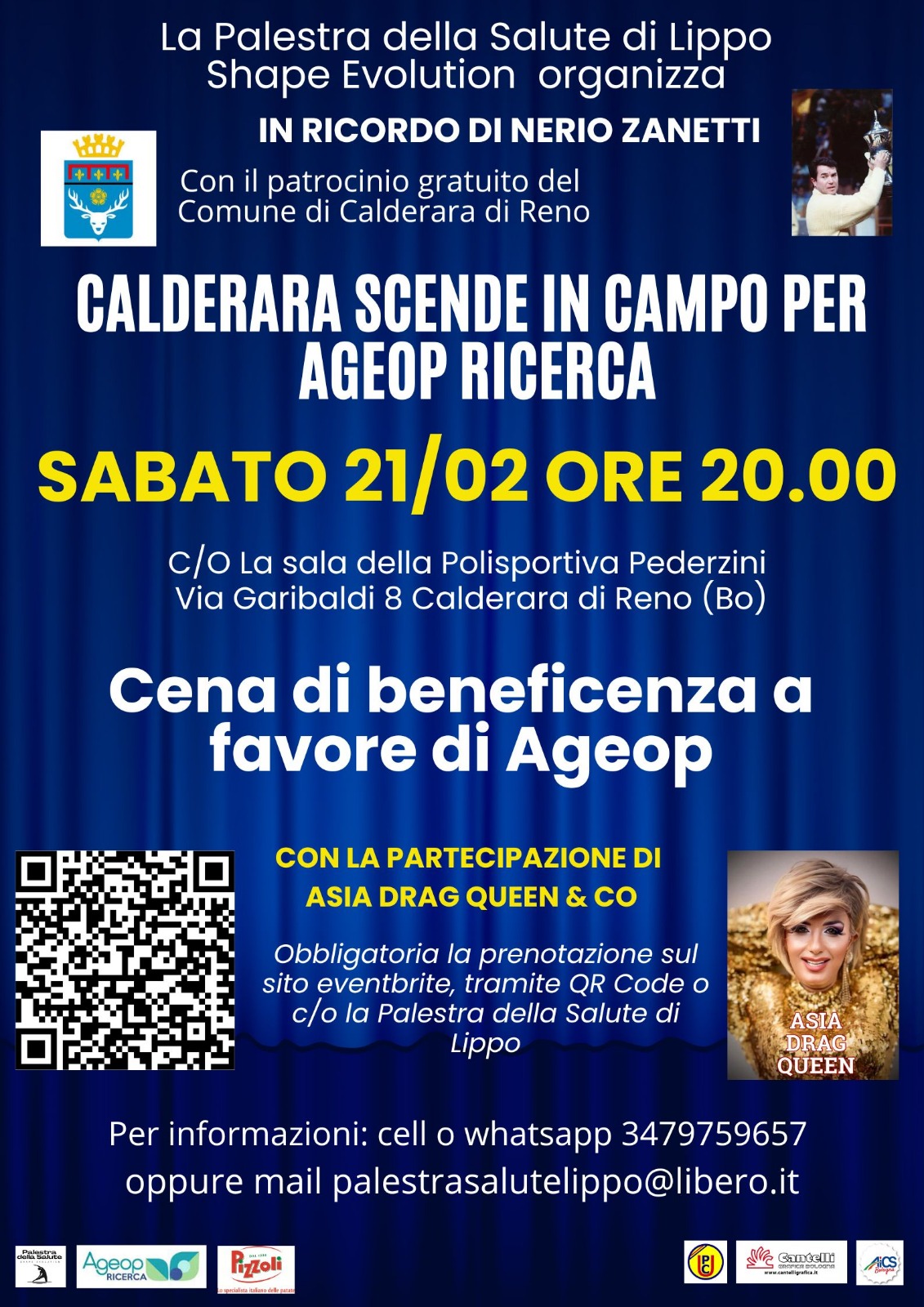 21/02 Presso la Polisportiva Pederzini a Calderara di Reno, ore 20.00 cena in ricordo di Nerio Zanetti, a favore di Ageop . Con il Patrocinio del Comune di Calderara di Reno, una cena di solidarietà con la partecipazione di Asia Drag Queen & Co.